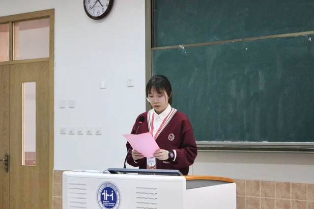 优秀班助理代表黄诗怡同学进行发言。她分享了这一年的工作感受以及工作经验。首先她提到了加入班助理团队的初心,坚定自己的初心才会更有动力去完成团队的工作,将每一件事情做细做实做精才能让自己有所收获。之后黄诗怡同学对实习班助理们提出了几点希望。一是保持不骄不躁、谦逊的态度去完成每一项工作;二是明确自身职责以及工作原则;三是多看多想多反思,总结自身的优势和短板,及时调整自己。最后黄诗怡同学鼓励台下所有实习班助理们要勇于探索和学习,并预祝大家能够在实习期内能够有所成长。