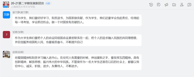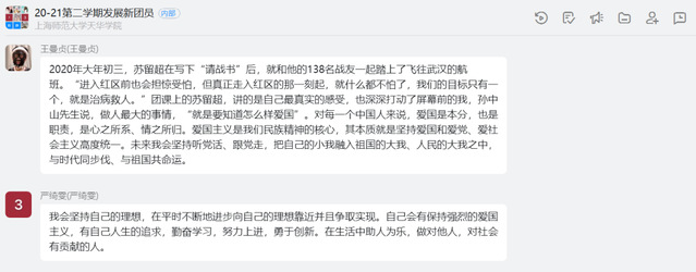 在本次团课学习中,组织部副部长和海伦同学从多方面解释了五四精神、入团动机以及爱国主义精神。