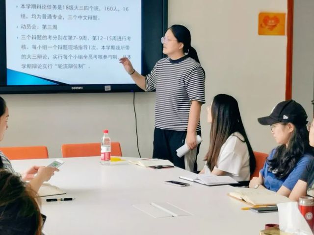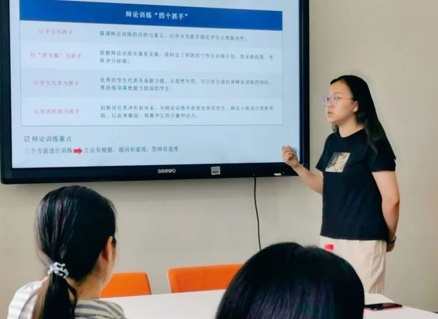 杨荻老师通过本学期的辩论训练工作,向大家传授了四点方法经验:注重破题,避免在辩论前遇到对辩题理解不清晰导致辩论内容不协调统一的情况;跨小组对抗,各小组正反方轮流进行跨组辩论,可以呈现不同的辩论训练效果;优秀人才输送,鼓励班级优秀辩手积极参与各项辩论活动,培养辩论兴趣;培养辩论负责人,除了在能力上的要求外,辩论负责人还需要有统筹管理班级辩论事务的能力,使每个小组有秩序的进行辩论训练。