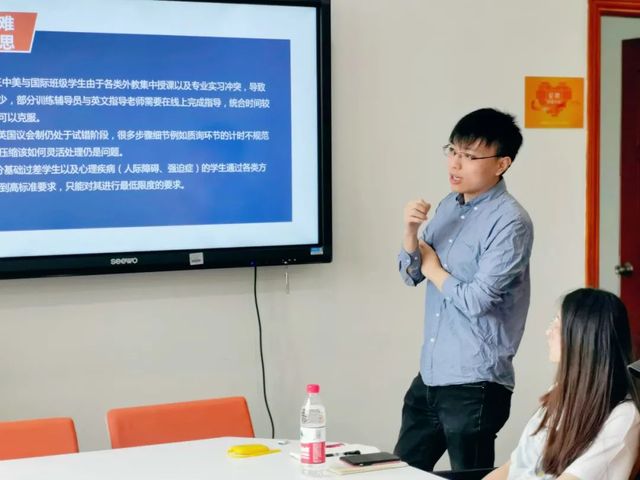 朱可老师针对本学期中英文辩论训练工作开展情况,总结了两方面经验:第一、有效组织管理,紧抓辩论质量;第二、注重英文演讲表达,鼓励学生敢于开口。同时,朱可老师反馈了在辩论训练开展过程中发现的问题,并提出了相应的建议:第一、同学们的英语口语表达能力仍有待提高,辅导员与英语老师可以以一对一的方式,在课外进行额外辅导训练;第二、采用辩位轮换的制度,争取让每位同学都参与辩论、提高自身辩论水平。