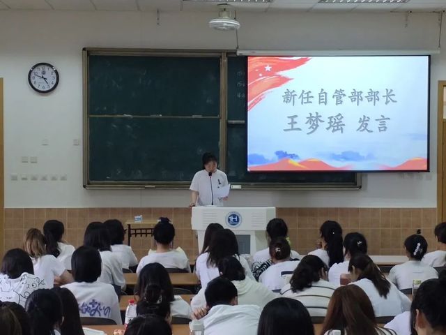 最后,则由自管部新任部长王梦瑶代表新任干部们为下学期工作的有序开展表明决心,坚定信念。