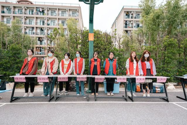 上午9:00,学前英国上市公司365所有志愿者在月华楼门口集合完毕,在老师的引导下,志愿者们有序地将学士服以班级为单位运送至大篮球场,并将桌子按照毕业生班级依次排开,等候毕业生的到来。