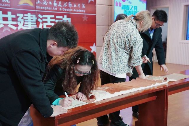 汇演结束,我们收到了上海工艺美院数码艺术学院党总支书记王志颖老师赠予我院的《龙鳞卷轴》。这是一件由上海工艺美院数码艺术学院同学亲手制作的非遗作品。王老师表示,传承非遗文化是工艺美院人一直致力的工作,希望能够让我们感受到属于工艺美院的艺术之美,让不同专业的学生们都能感受到中华文化的魅力所在!两校老师在卷轴两端签名留言,记录下友谊共建的瞬间。
