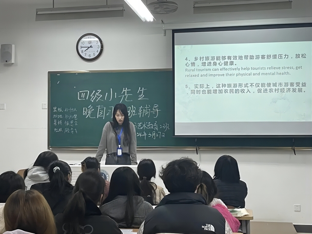 本周翻译作文组康韫、韩思瑶、杨荟妮三位小先生分别进入23级学前教育1班和23级艺术教育1、2班开展翻译与作文的指导。首先是翻译的真题练习,三位小先生对翻译中的重点词汇与词组做了提问和讲解,并在分析完翻译后针对重点进行了巩固。接着是作文的练习,小先生们分段进行了作文范文的讲解,为同学们理清了写作时的步骤和思路,提炼出了范文中的重点句型和词汇,并在最后讲解了作文中常用的连接词,供同学们积累。