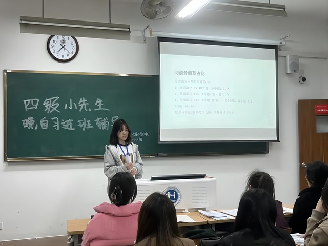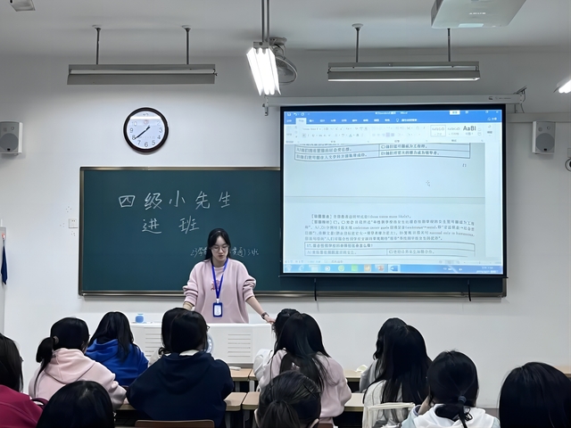 本周阅读理解组奚慧玲、姜凯莉、牛慧慧三位小先生分别进入23学前教育(中外合作办学)1、2、3班,开展仔细阅读专题辅导。三位小先生重点讲解了仔细阅读的分值占比、题型、解题思路以及技巧,分析四级考题常考的重难点,并且通过练习四级真题感受考试难度,加深做题技巧的理解,学会圈画关键词,减少主观臆断,用不同技巧解题。最后,三位小先生进行现场答疑,帮助同学解决疑问。