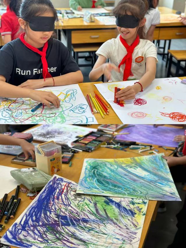 在老师的引导下,学生们开始感受和反思自己的情绪。通过四位助教的启发与鼓励,同学们蒙上双眼,勇敢地运用色彩在画布上进行创作。此次创作不仅是绘画,更是一次情绪的释放。色彩与线条在画纸上交织,将同学们丰富且真实的内心世界展现地淋漓尽致。