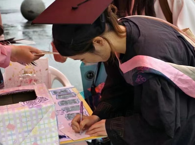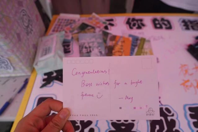 学弟学妹们也主动地参与到了活动中,用真诚的笔触,在明信片上写下对毕业生们的诚挚祝福。祝愿他们在未来的道路上,一帆风顺,前程似锦。同时,他们有的还在明信片上画了一些具有代表性的小插图,例如学士服和学士帽,让毕业生们在抽到后,过上一段日子再一次拿起它时,还能浮现出对于毕业季清晰的记忆,也为此次活动注入了更多的青春活力。