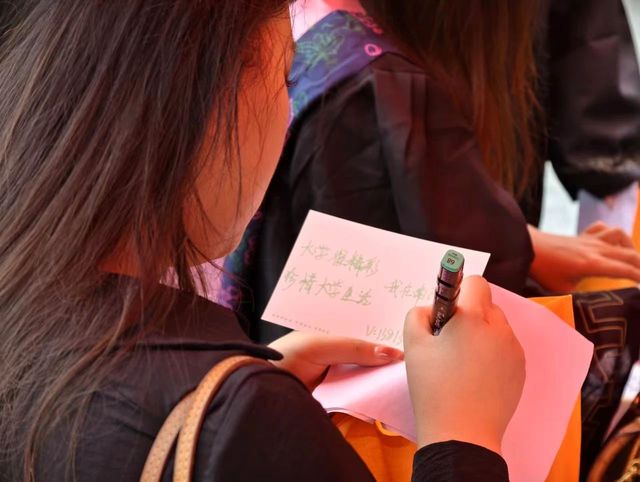 毕业生们纷纷拿起笔,在明信片上留下对学校的深深眷恋与祝福,同时充满了对青春岁月的感慨。不同颜色的笔尖在印着励志祝福语的彩色明信片上跃动,书写下的每一字每一句,都是对过去多彩时光的怀念和对未来的美好憧憬。同时,他们不仅表达了对母校的感激之情,更将宝贵的经验与建议,化作一句句温馨的寄语和祝福,送给即将开启并踏上新征程的学弟学妹们。