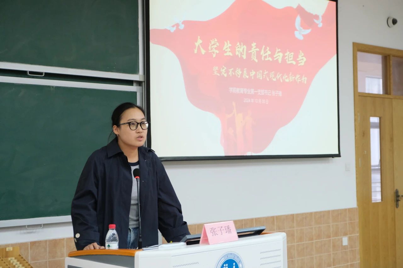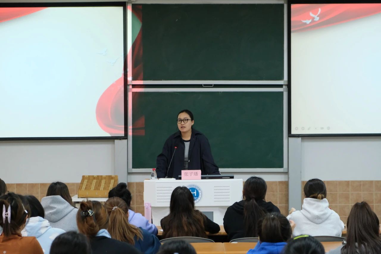 接着,张子璠老师强调了树立正确入党动机的重要性。她指出,青年大学生入党时应心怀家国情,心系中国梦,认真学习党的先进理论知识,提高思想觉悟,积极参与社会实践活动,不断提升自身的实践能力和创新能力。她呼吁同学们牢记自身的职责与担当,努力奋斗,以青春之我投身祖国建设事业中,积极发挥模范带头作用。