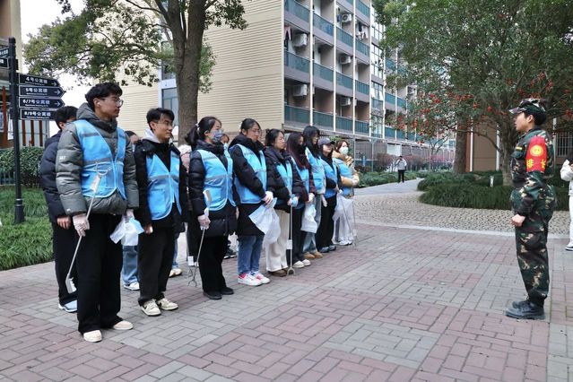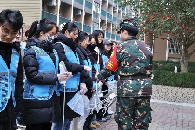 活动当天17:00,21位志愿者准时在综治办门口完成集结,全体成员规范佩戴防护装备,分领垃圾钳、垃圾袋等工具,对校门口绿化带处卫生死角实施定点清理。