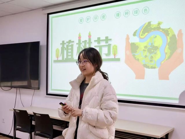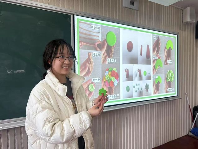 第一个环节是活动导入,由范俊妍同学担任主持人通过问答环节,来引入本次志愿服务的主题——“植树节”手工制作,并调用PPT以及图片详细介绍了制作超轻粘土树的步骤。同时主持人还详细介绍了不同的制作方式以及植树节的意义,在鼓励学员大胆创新的同时也丰富了活动内涵。