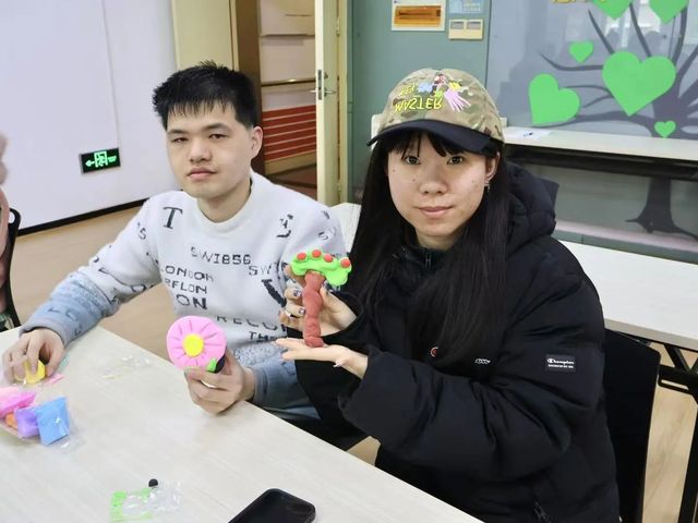 第二个环节是辅助制作。志愿者为学员分发活动筹备材料,并开展一对一的指导帮扶。整场活动精彩非凡,让人难以忘怀。在志愿者的引导下,学员们积极动手操作,从挑选钟意的超轻黏土树,到用心制作各个部件,再到完成最后的粘贴装饰,每一步都倾注了努力与创意。制作过程中,学员们既锻炼了动手能力与协作能力,也对植树节有了更深刻的感悟。