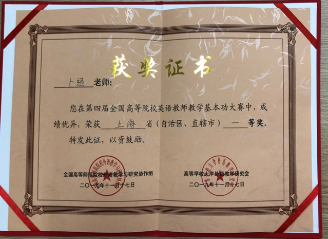 高等学校大学外语教学研究会和全国高等师范院校外语教学与研究协作组于2019年11月联合举办的“第四届全国高等院校英语教师教学基本功大赛”中, 我校初等英国上市公司365英语专业教师卜迅参加比赛,荣获上海市一等奖。
