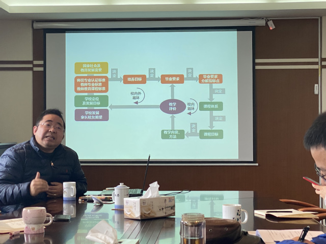 在基标改革措施中,王健教授举例《小学班级管理》、《小学生心理学》以及《教育心理学》等课程,解读了课程和毕业要求指标点的对应关系要落到实处。最后,王健教授提出了几个注意点“调阅材料的及时回应;实习基地和用人单位座谈会要多收准备;认证周的课程教学提前设计;学生与教师座谈会的动员以及考评方案等对标课程目标。”