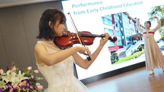 2019级英语(国际课程合作)专业学生代表张文珺发言,真挚地表达对合作项目的感谢,并表示对未来的学习生活充满期待。三个专业的学生分别为与会嘉宾准备形式多样的才艺展示:英语(国际课程合作)专业现代舞串烧、学前教育(国际课程合作)专业小提琴与中国舞结合、应用心理学(国际课程合作)专业乐器表演,与会嘉宾连连称赞。