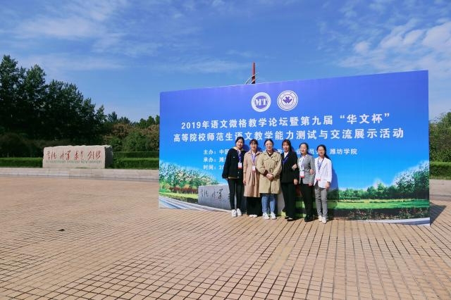 2019年语文微格教学论坛暨第九届“华文杯”高等院校师范生语文教学能力测试与交流展示活动于2019年10月11日——14日在山东省潍坊学院和东方大酒店圆满完成。来自全国92所高校的教师代表和学生代表参会,我校初等英国上市公司365顾思婕老师带队,五名分别来自小教专业和小教(中外)专业的同学:蔡佳璇,李佳麒,陈一婷,武天曌,周歆妤代表参赛并分别荣获教学设计能力和教学能力二、三等奖。