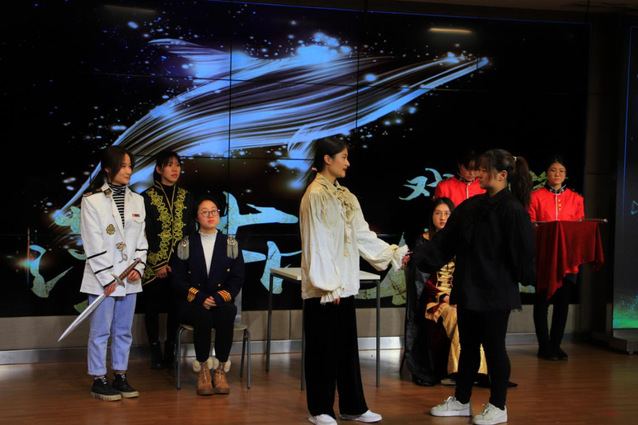 本次晚会表演人才荟萃,成扬同学为我们带来了《再别康桥》英文诗歌朗诵,其甜美的嗓音配上优美的旋律,将老师和同学们拉入了一个依依惜别的场景里;李尚亿和郭颖同学深情演绎了经典情诗《红红的玫瑰》;还有陆少敏同学为我们带来了汉语英文粤语三种不同语言朗诵的中国古诗,让我们感叹语言的魅力的同时又带我们沉浸于诗情画意之中。除了精彩的朗诵,还有王怡婷的英文歌曲《Love story》演唱和王贞晶带来的《哈姆雷特独白》演绎,纯正的发音和恰当的展现,引出了本场晚会最精彩戏剧表演环节。