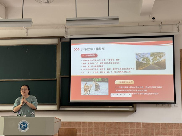 最后,办公室主任陈钰蓉对开学教学工作进行提醒,要求教师核对课程、检查设备,备齐教学资料,按时到岗,并完成试卷提交与补考登分等工作。