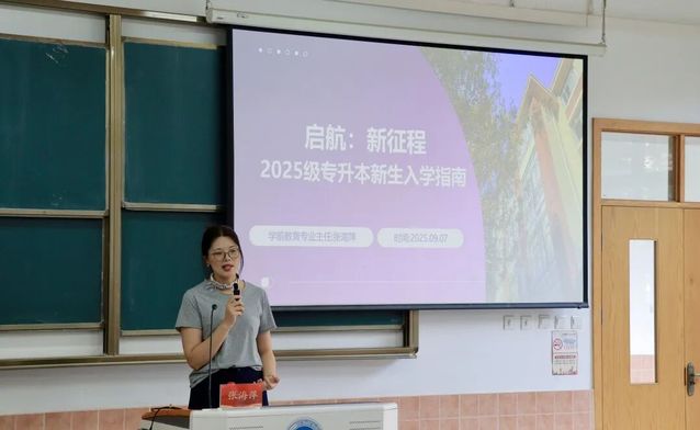 学前教育专业主任张海萍面向学前教育(专升本)、学前教育(专升本双语)专业学生展开介绍。她首先欢迎新生,强调入学初期做好学习规划的重要性;结合学前教育重实践、双语方向强应用的特色,鼓励新生注重实践锻炼,提升双语教学能力与综合素养,还要加强师德修养,坚定投身学前教育事业的信念。