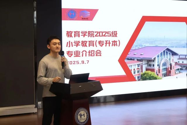小学教育专业主任叶彬恩针对小学教育(专升本)专业开展培养目标专题解说。他详细解读体育与信息技术融合的特色课程体系、分阶段实践教学安排,以及中小学及相关领域就业方向,帮助新生清晰把握本专业学习重点与未来职业发展路径