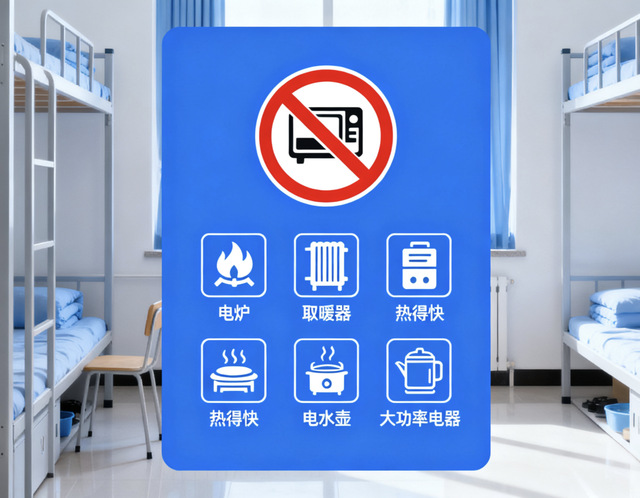 寝室内严禁使用大功率电器,包括但不限于电炉、取暖器、热得快、电水壶、电热锅、电饭煲、蒸蛋器、微波炉、电热毯、冰箱、洗衣机、制冰机、塑封机等。