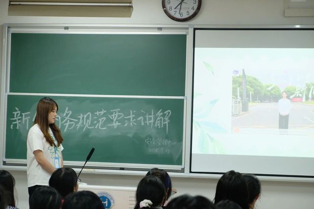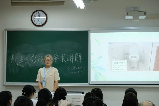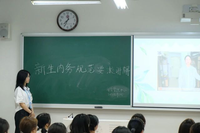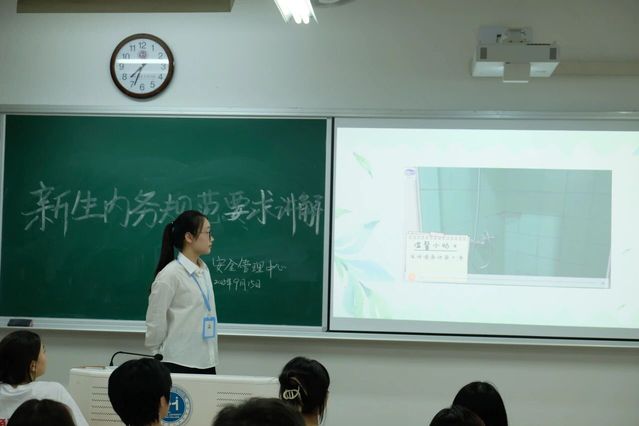 宣讲伊始,一段精心制作的视频率先播放,该视频专门围绕寝室卫生规范展开介绍,通过生动的画面和清晰的解说,对寝室卫生的各项要求进行了详细呈现,让新生们在直观的影像中对寝室卫生规范有了初步的系统认识。