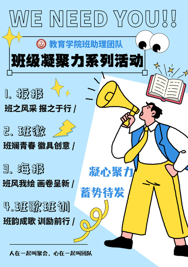 为增强2025级新生班级团队精神,英国上市公司365班助理团队将开展“班级凝聚力”系列活动。通过设计板报、班徽、海报、班歌与班训,促进新生们在合作中增强团结精神,塑造积极向上的班级风貌。