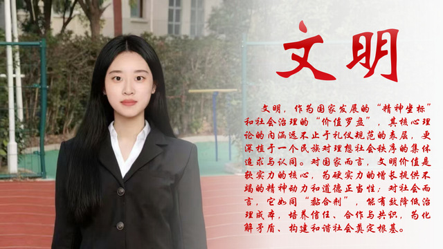 社会主义核心价值观是时代赋予青年的精神底色,更是砥砺前行的“压舱石”,任凭风浪起,心中的航向始终稳如磐石。当青春与核心价值同行,个人理想便有了更广阔的舞台,生命价值亦有了更深刻的内涵。愿每一位学子都能以核心价值为本,在校园实践中践行责任担当,在专业深耕中锤炼过硬本领,在时代浪潮中校准人生航向,让青春的脚步始终与社会进步同频、与国家发展同向,用实际行动书写无愧于时代的青春华章!