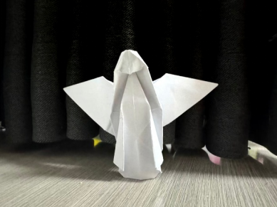在我折纸时,看到这些折纸,觉得心灵和折纸是一样的。折的时候要一道一道折痕慢慢弄,像生活里处理那些情绪,得慢慢捋顺。在折图片中天使的时候,因为步骤较为复杂,有可能一步错步步错,但是保持良好的心态总会战胜的,所以在面对困难时,良好的心态会让我们战胜一切的。