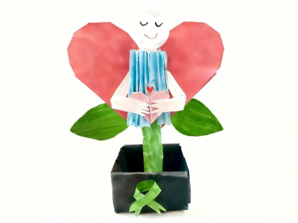 这幅折纸作品以爱心翅膀小人为主体,其怀抱的红心与背后羽翼呼应,象征守护心灵之光。盆栽中的绿植如心灵之树蓬勃生长,黑色盒身外的绿色飘带标志点明精神卫生主题。多重爱心元素交织,将心理健康与环保理念相联结,呼吁以温暖善意共护心灵沃土,让爱与生机同行。