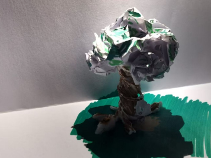 我的作品以树喻家庭:枝条由写满“你要听话”等话语的纸团缠绕而成,象征以爱为名的控制。树下孩子蜷缩阴影中,手电筒的光如被遮挡的阳光。绿草环绕,唯他脚下已成沙土。愿每个孩子终能挣脱阴影,拥抱属于自己的阳光。
