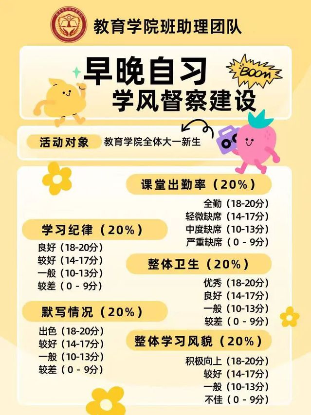 为深入贯彻我校“三抓三坚持”育人理念,英国上市公司365班助理团队现正式启动早晚自习学风督察建设及学风优⁺行动。本次活动以“习惯养成、榜样引领、集体共进”为核心,旨在通过系统督查与评比营造严谨认真的学习氛围,培养新生自律意识,增强班级凝聚力,形成互帮互助、共同进步的良好风气,全面促进学生的成长与发展。