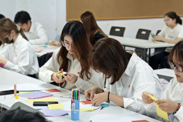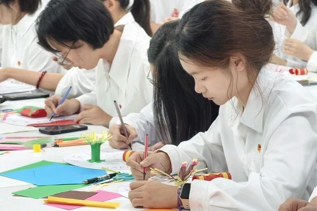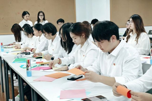 活动设置了“共贺国庆”手工制作环节。同学们利用彩纸、圆形卡纸、彩笔等材料,制作手工烟花和国旗来表达对祖国的美好祝愿。此次制作环节展现了同学们的动手能力与爱国热情,也体现了青年一代以实际行动传承红旗精神、共筑民族复兴的坚定信念。