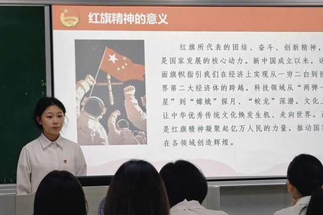 红旗精神以团结、奋斗、爱国、担当为核心,是中华民族的精神图腾。活动中,同学们回顾了国家在经济、科技、文化等领域取得的辉煌成就,红旗精神始终是推动国家发展的强大动力。作为新时代青年,我们应继承和发扬红旗精神,将其转化为刻苦学习、勇于实践的实际行动,在为国家发展的奋斗中实现青春价值。