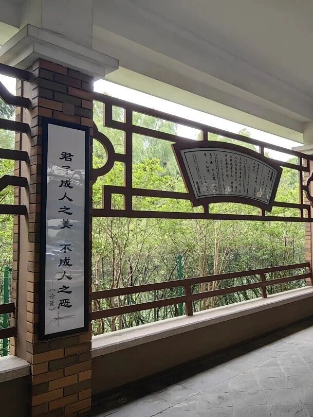 漫步长廊,亭台两侧的对联“天道千秋盛,华章万世传”格外醒目。这副对联暗藏“天华”二字,是学院深厚文化底蕴与宏伟愿景的生动写照。长廊的墙壁上,陈列着大量古代先贤的智慧箴言和《三字经》、《千字文》等启蒙读物。这些内容从奉献到爱国,从诚信到勤奋,无不在潜移默化中传递着优秀传统文化。