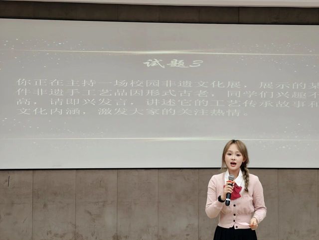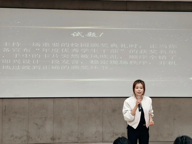 第一轮得分统计完毕后,选手们根据排名顺序依次上台随机抽取即兴题目。面对挑战,他们沉着冷静,在短短六分钟内迅速构思。随后的即兴主持环节,选手们从妙语连珠的开场,到引人入胜的临场发挥,每一个环节都展现出高水平的主持天赋和专业综合素养,瞬间将全场气氛推向最高潮。