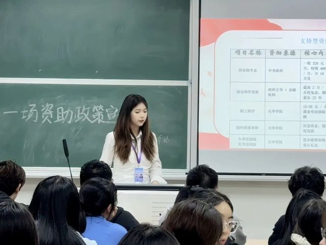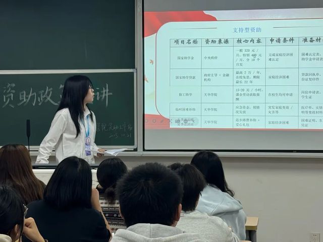 在“支持型资助”环节,重点讲解了“绿色通道”、助学金与勤工助学等帮扶措施,引导有需要的同学提前准备材料、及时关注通知。