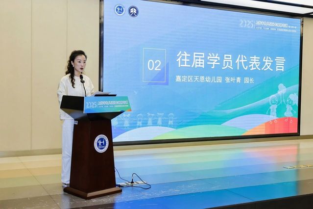 嘉定区天恩幼儿园园长张叶青作为往期优秀学员代表交流分享。她对上海市教委、各区教育局搭建的宝贵的学习平台表达了感谢。回顾上一年度为期六个月的培训,她用“组织关怀有温度,课程滋养有深度,携手同行有厚度”总结了研修过程中的体会。在研修过程中,她也感悟到年轻的幼儿园园长必须锤炼好的三种关键能力:一是要上接天线,把准方向;二是下接地气,要深扎教育教学的一线实践;三是要中通人和,要学会凝心聚力,发挥好每一位保教人员的特长和爱心。她激励新一批园长们以此次培训为新起点,以更加饱满的热情、更加坚定的信心、更加务实的作风,保持归零的心态、冲刺的姿态,共同开启这段学习旅程!