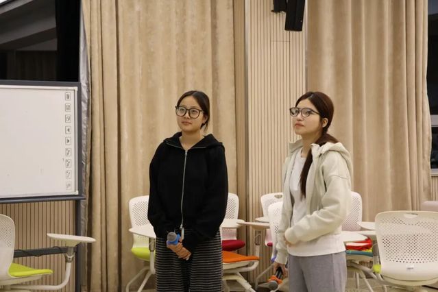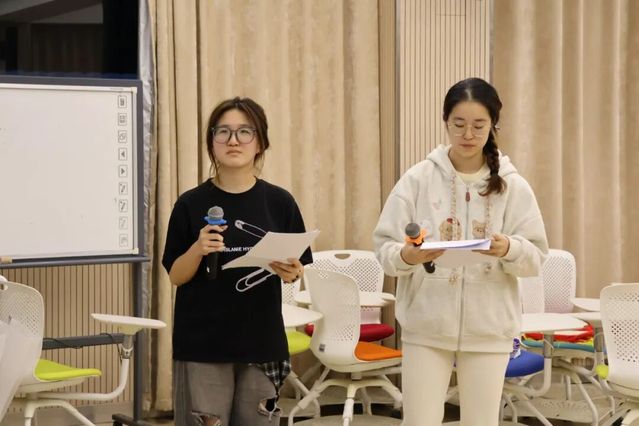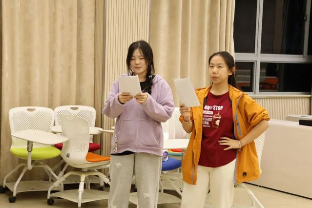 第二组选手是来自25学前教育(中外合作办学)3班的傅雨涵、郎熠菲,配音作品为《知否知否应是绿肥红瘦》,她们用富有张力的声音塑造角色,将作品里的氛围传递得淋漓尽致。