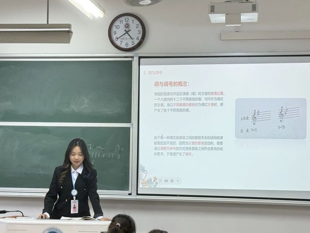 黄欣俐小先生则从“歌曲为什么有不同音调”切入,用升降号卡片互动演示升号调、降号调的形成,通过集体哼唱练习,帮学生掌握首调与固定调唱名法,又以分组匹配的方式,让大家轻松分清等音调、关系大小调等调的关系。学生们不仅学会了基础音乐概念,更提升了实操与辨析能力,对调号的实际应用有了清晰认识。