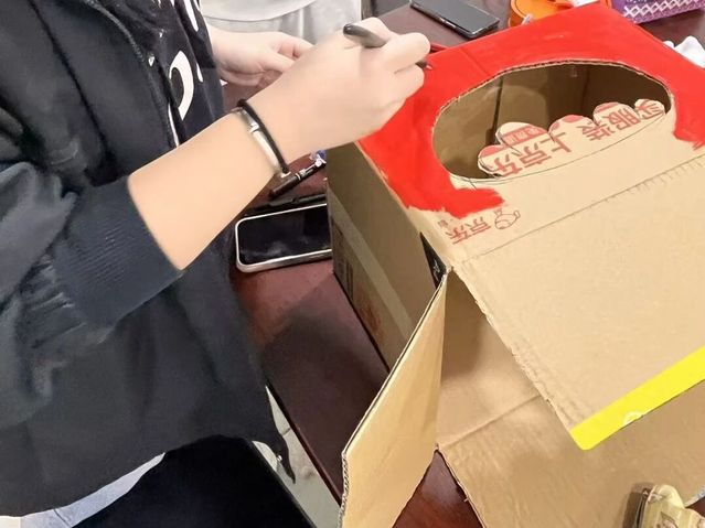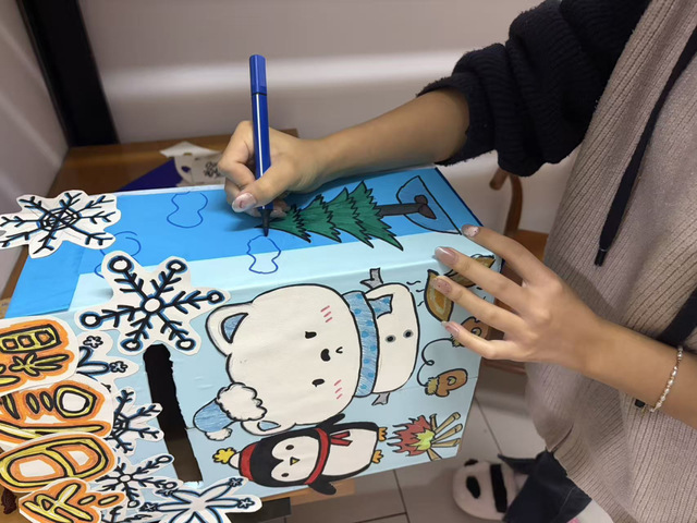 他们以纸箱剪出信箱主体,绘制了可爱的企鹅和北极熊形象并粘贴,再添加雪花装饰和“冬日信箱”字样。用彩笔和贴纸点缀,让整体更生动。通过这次合作,他们体会到团队分工的重要性,每个人的创意和努力让作品更完整。看到成品时,既成就感满满,也期待收到温暖的信件。
