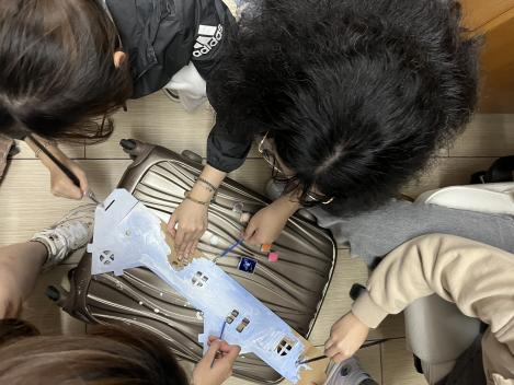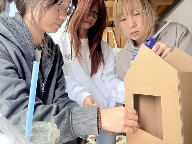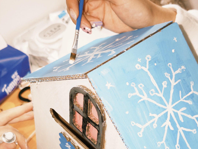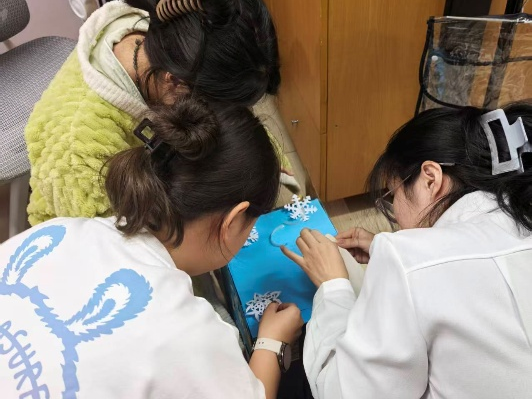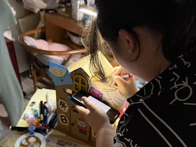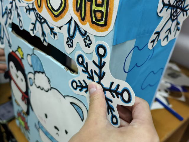 这是一个可爱的手工“冬日信箱”,整体以浅蓝和白色为主,屋顶装饰着雪花、猫咪等冬日元素。团队成员们围聚一处,以画笔为媒,精心描绘着信箱上的雪花与炉火。在创意的碰撞与无声的默契中,冬日的融融暖意于指尖悄然凝聚。这份共同的作品,让大家深深领悟了合作与创造带来的温度与力量。