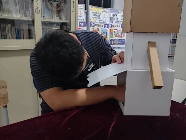 这位同学的“冬日信箱”以雪人为灵感创作。制作时,他用白色与牛皮色纸板制作了三个立方体,作为身体与头部,塑造雪人的轮廓。投信口开在前部最大的立方体下方,保证有一定的存储空间;后方开门较大便于取件。这次活动让他体会到,用朴素的材料也能创造出充满冬日童趣的暖心角落。