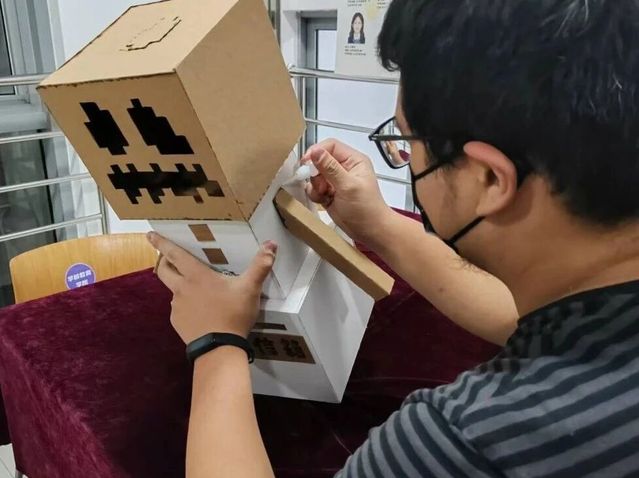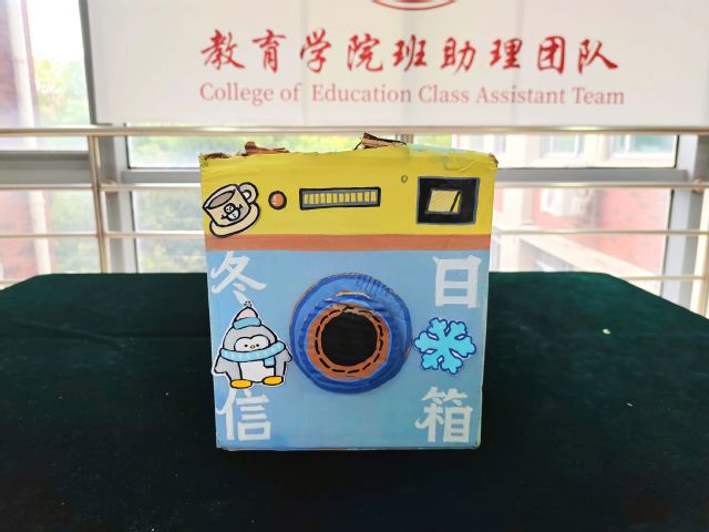 这个小组的冬日信箱是小怪兽造型,用了纸箱、彩绳、羽毛等拼贴。红色外表象征年兽,头顶扭扭棒化作烟花绽放,投信口是它的大嘴巴,正等接住冬日的温暖絮语。为校园寒冬里,增添一份年俗与善意交织的热乎气。