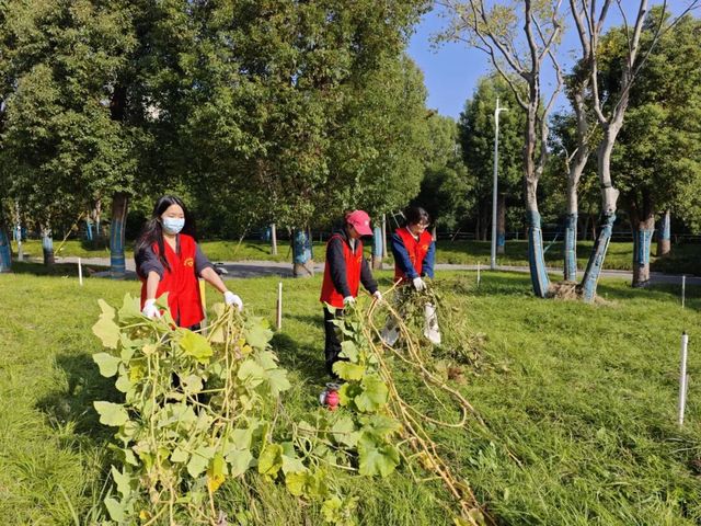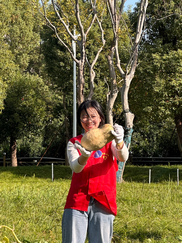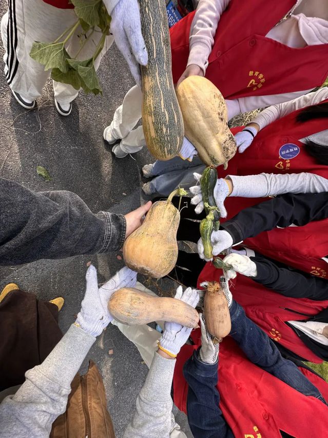 更让人惊喜的是在清理杂草堆时,有志愿者突然发现了几枚圆滚滚的瓜正藏在枯草下,连带着几株蔫蔫的瓜藤也露了出来!原来这片荒地早悄悄结了“宝藏”,这下不光有整洁的菜园,还多了份意外的“丰收礼”。看着亲手焕新的小天地,怀中抱着刚刚发现的各色瓜果,同学们满心自豪,所有辛苦都化作了无以言表的欣喜与成就感。