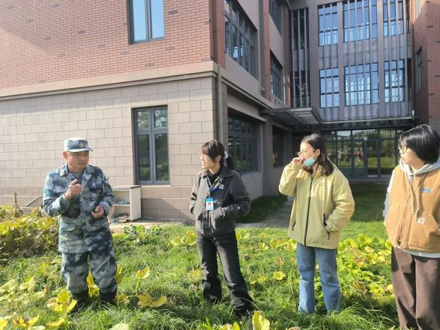首先,魏师傅与在场的师生打招呼,大家纷纷向师傅致以问候,表示期待即将进行的实践活动。魏师傅随后对实践场地进行了介绍:该区域是校内专门规划的劳动实践小菜地,尽管地块面积有限,但作物生长状态良好;几畦当季叶菜叶片翠绿饱满,旁侧还错落分布着矮株瓜果,整体生机盎然。