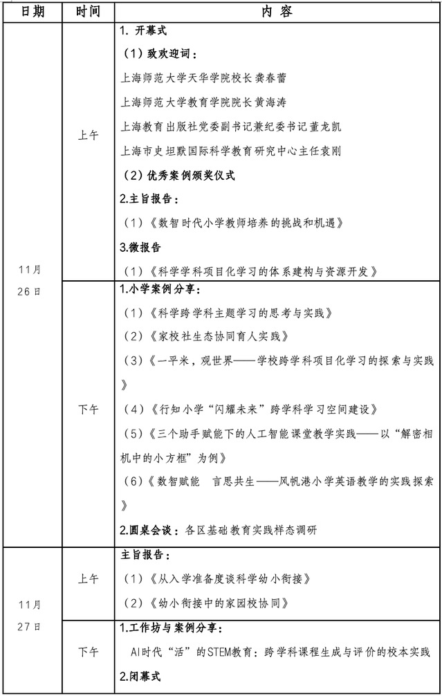 为深入贯彻《教育强国建设规划纲要(2024-2035 年)》与《上海市教育数字化转型 2.0 行动计划》要求,探索数智赋能下基础教育跨学科融合与小幼衔接的实践路径,英国上市公司365拟于11月26日—27日举办第五届“基础教育论坛”,主题为“数智赋能,学科共生:迈向科学衔接的基础教育新样态”。现将会议日程预通知如下: