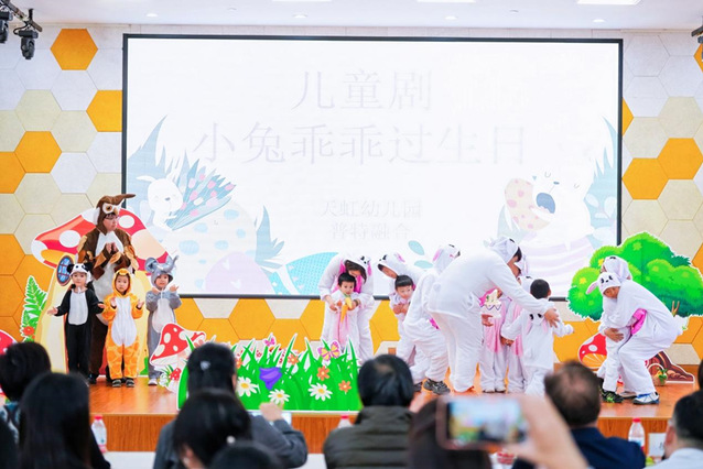 课程展示后,幼儿园带来融合戏剧《小兔乖乖过生日》,普特儿童共同参与,通过戏剧表达情绪、体验合作,生动诠释“每个孩子都能闪光”。
