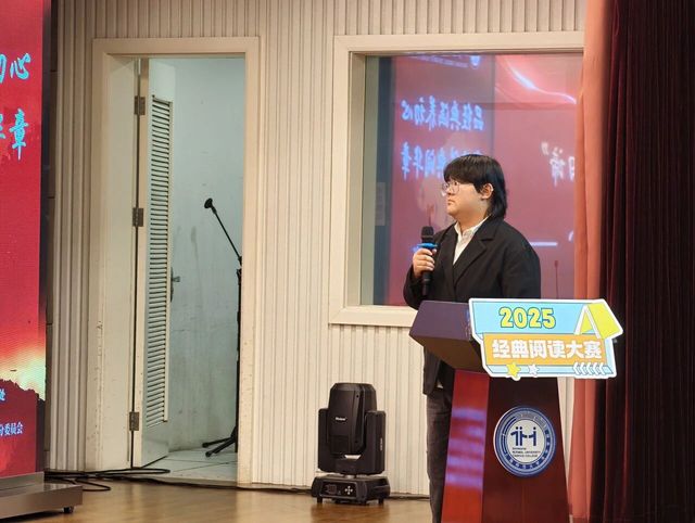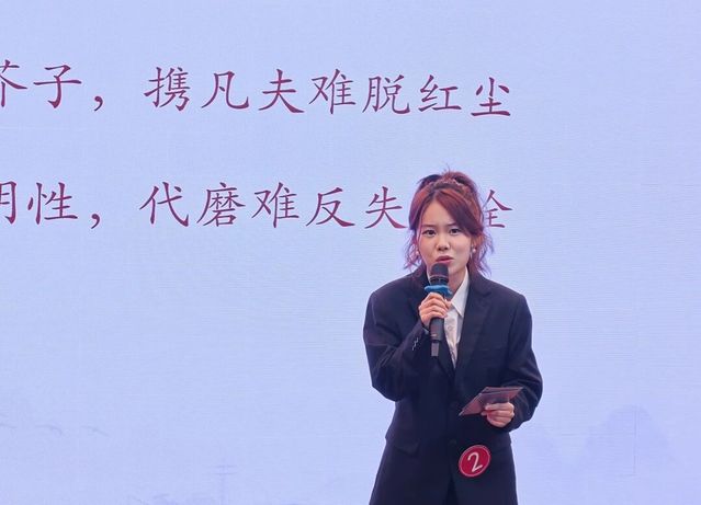 语言文化学院23汉语言文学2班的王培熠同学,她演讲的篇目是《红楼梦》,她以“梦与醒的辩证:在幻灭中追寻真实”为主题,深入探讨了《红楼梦》中“梦”与“醒”的哲学张力。他通过黛玉葬花、宝玉出家的经典情节,提出生命的意义不在于追求永恒圆满的结局,而在于认真生活过程中每一个真实燃烧的瞬间,展现了面对幻灭时依然保持的勇气与智慧。