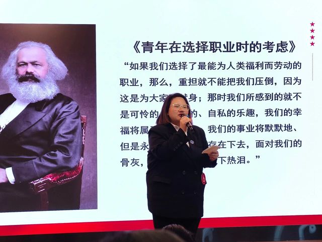 健康学院22应用心理学1班的郝嘉聿同学,她演讲的篇目是《共产党宣言》。她在演讲“理想照亮青春——从青年马克思到新时代的我们”中,以马克思的崇高理想为引,分享了其17岁时中学毕业论文里为人类福利而劳动的职业理想,以及《共产党宣言》诞生的伟大意义。结合校园生活,她展现了天华学子在各类活动与赛道上的奋斗风采,呼吁大家将小我融入大我,让青春在奋斗中熠熠生辉,汇聚成照亮未来的星河!